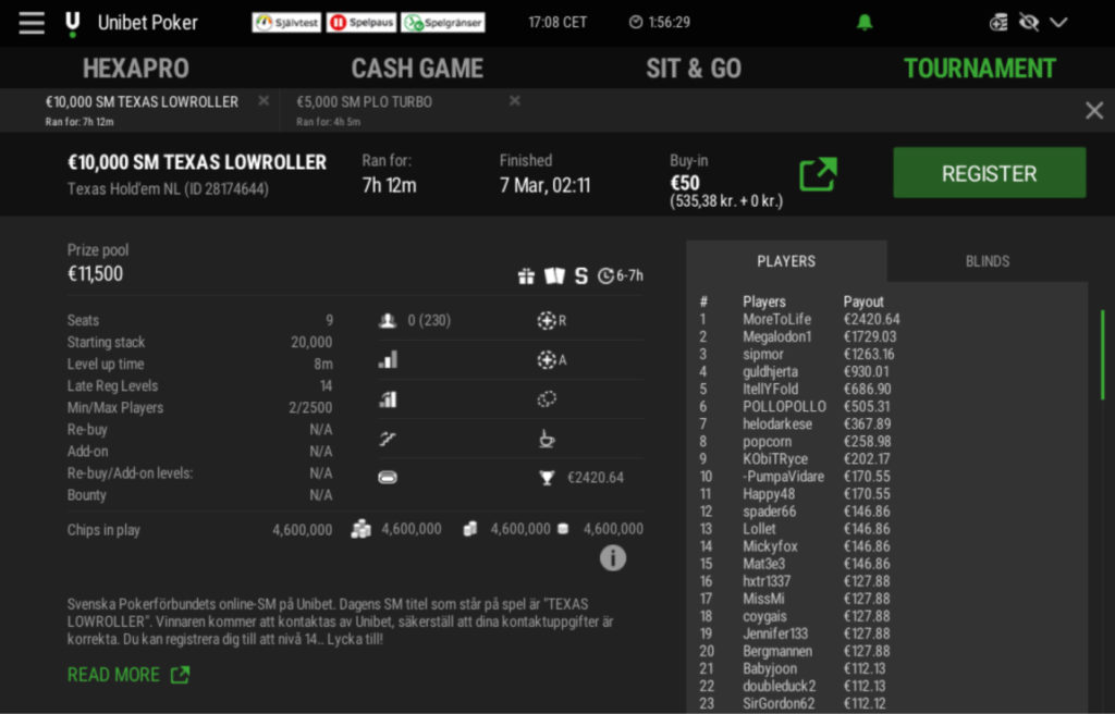 Resultat Finalbord Poker-SM Online 2022 Texas Lowroller