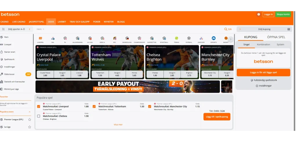 För oss är det glasklart att Betsson tillhör den svenska marknadens bästa bettingsajter. De erbjuder konkurrenskraftiga odds oavsett om du vill spela på Allsvenskan, SHL, Serie A eller mindre ligor inom nischade sporter, och en bra upplevelse när det gäller betalningar samt mobilt spelande.