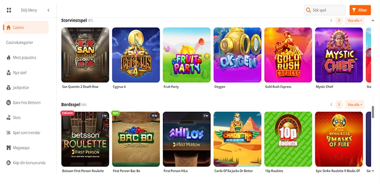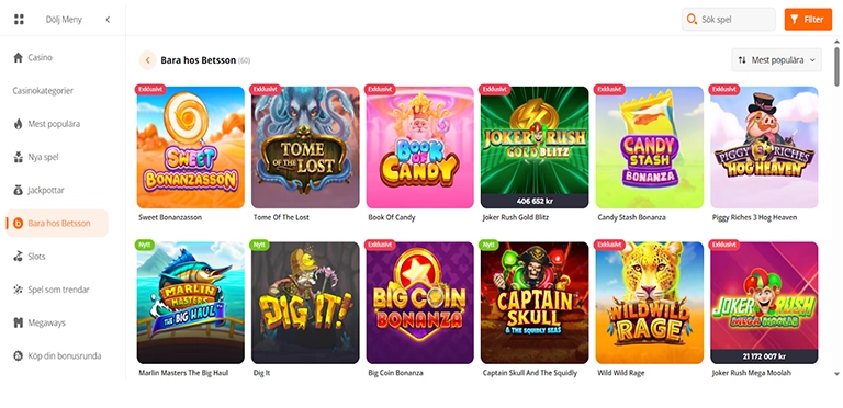 En viktig underkategori är jackpottspel, och här levererar Betsson riktigt bra: De har över 340 olika spel med jackpottar! Det finns dessutom en kategori vid namn ”Bara hos Betsson”, där du hittar 60 exklusiva titlar.