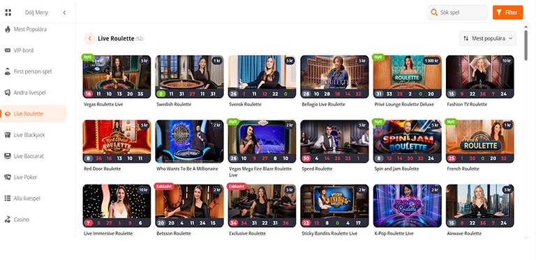 I Betssons live casino kan du spela roulette, blackjack och andra casinospel med svenska dealers dygnet runt. Det finns även massor av internationella bord om det tilltalar dig mer.